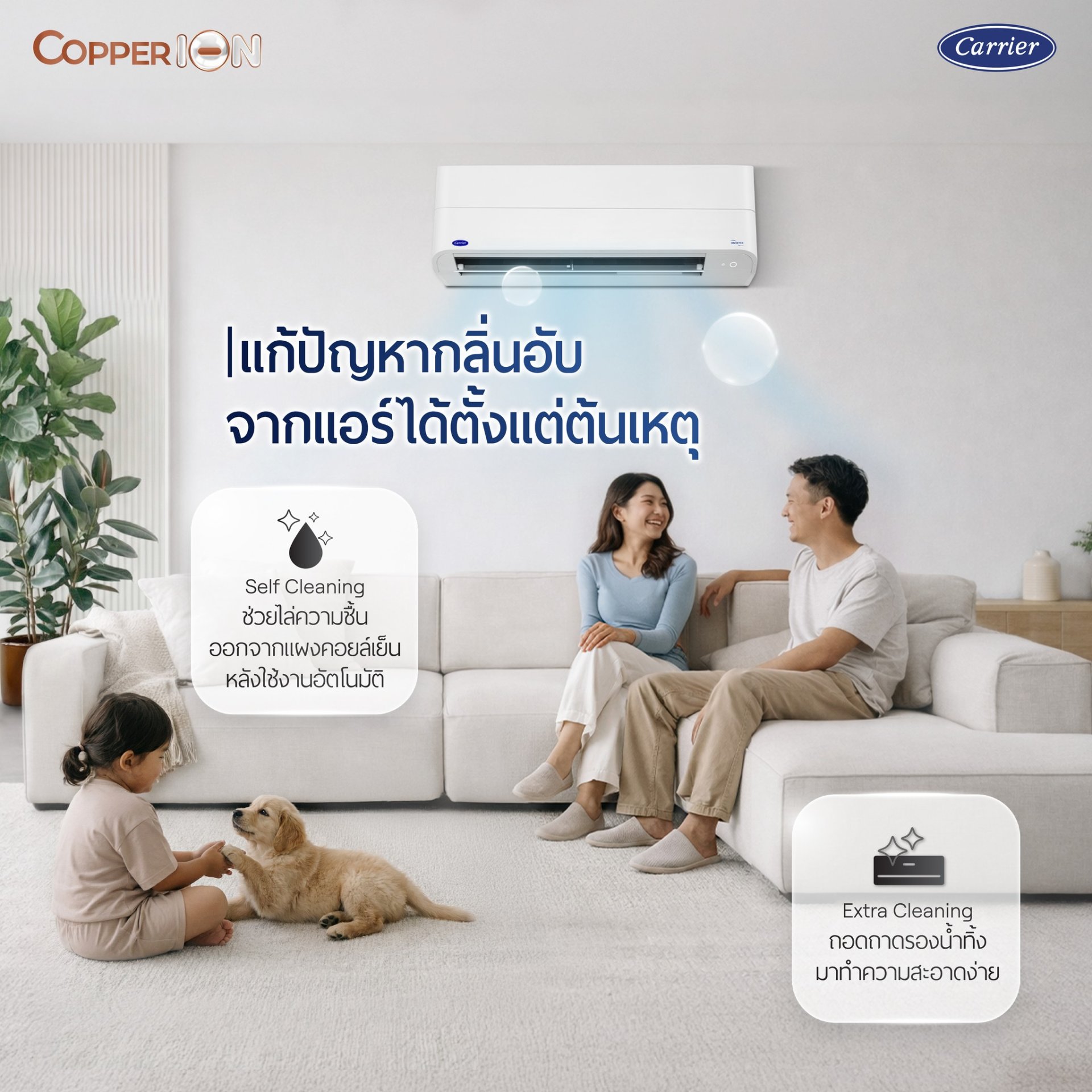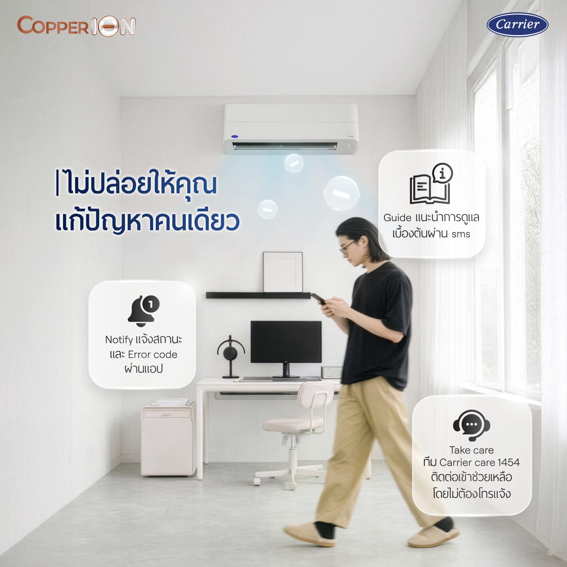 อยากได้แอร์ฟังก์ชันครบ ๆ ต้อง “แคเรียร์ Copper ION” .ด้วยฟังก์ชันจัดเต็มแบบคุ้มครบ ☑️ COPPER COIL : คอยล์ทองแดง ทนทานทุกสภาพอากาศ ☑️ X-IONIZER : ระบบฟอกอากาศ ปล่อยประจุ ION ช่วยกำจัดฝุ่น, PM 2.5, เชื้อโรค และแบคทีเรียในอากาศ ☑️ PM 2.5 FILTER : กรองอากาศสะอาด ดักจับ PM 2.5 และเชื้อแบคทีเรีย ☑️ CONTROL WITH TECHNOLOGIES : ควบคุมการทำงานผ่าน WIFI ☑️ WIFI ALERT : ตรวจสอบ ERROR CODE หากเครื่องปรับอากาศมีปัญหา พร้อมแจ้งเตือนการทำงานผิดปกติผ่านแอปฯ Carrier In The Air และ SMS ☑️ รับประกันคอมเพรสเซอร์ 7 ปี อะไหล่ 3 ปี ฟรีค่าแรง 3 ปี